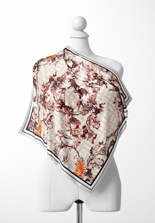 Oriental Blooms Geometric Scarf in Cotton Voile - Rust