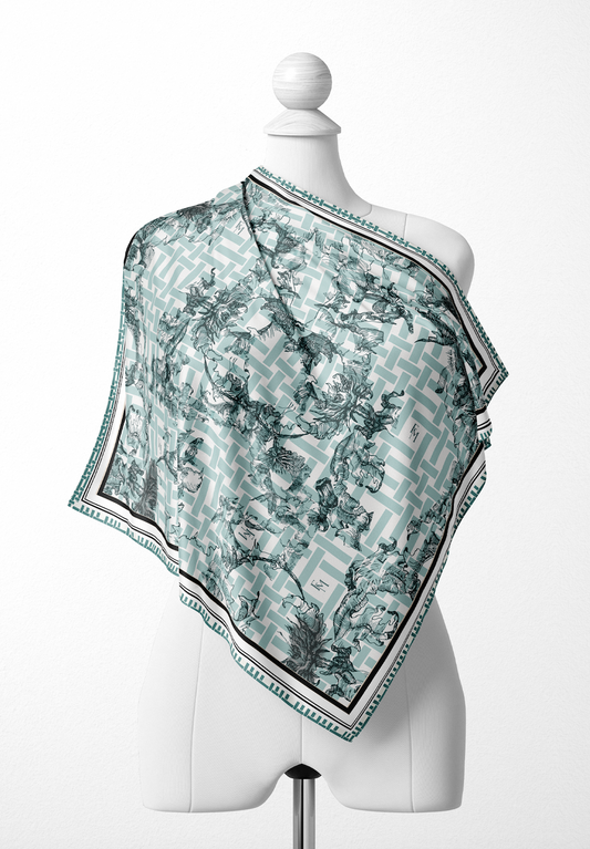 Oriental Blooms Geometric Scarf in Cotton Voile - Teal