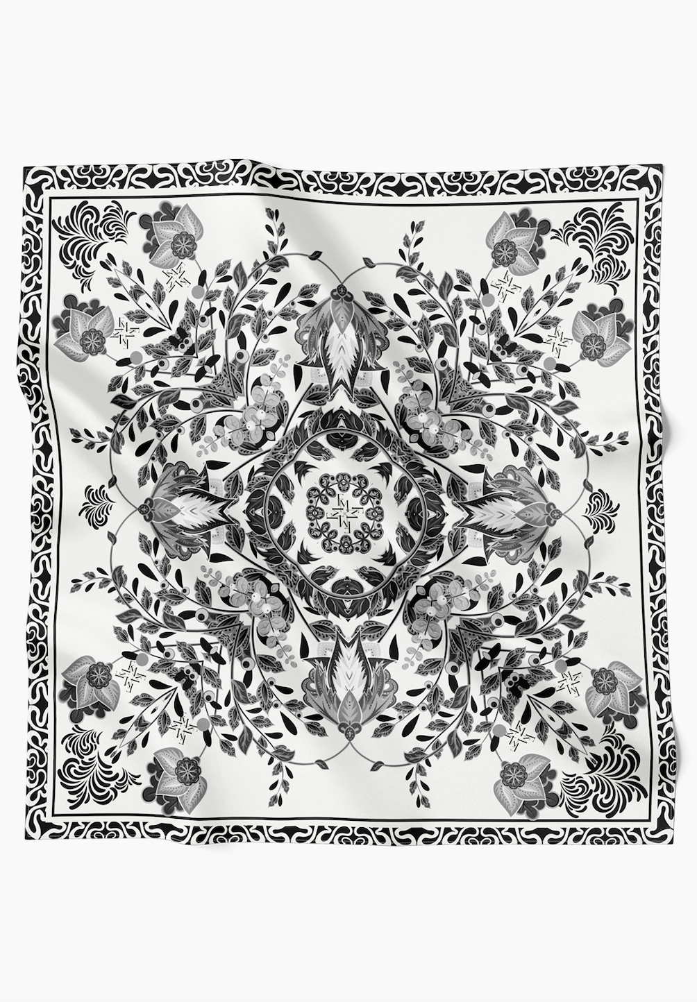This scarf presents a delicate and intricate design, featuring a kaleidoscopic mandala, radiating out into an array of florals and paisley elements with a persian influence. The elaborate central pattern is flanked by a quartet of larger, detailed flowers at each corner, which adds symmetry and visual interest. Surrounding the rich tapestry of botanical motifs is a deep, maroon Greek key border, framing the design with a classical touch. The overall effect is one of timeless elegance, combining traditional motifs with a modern color palette.