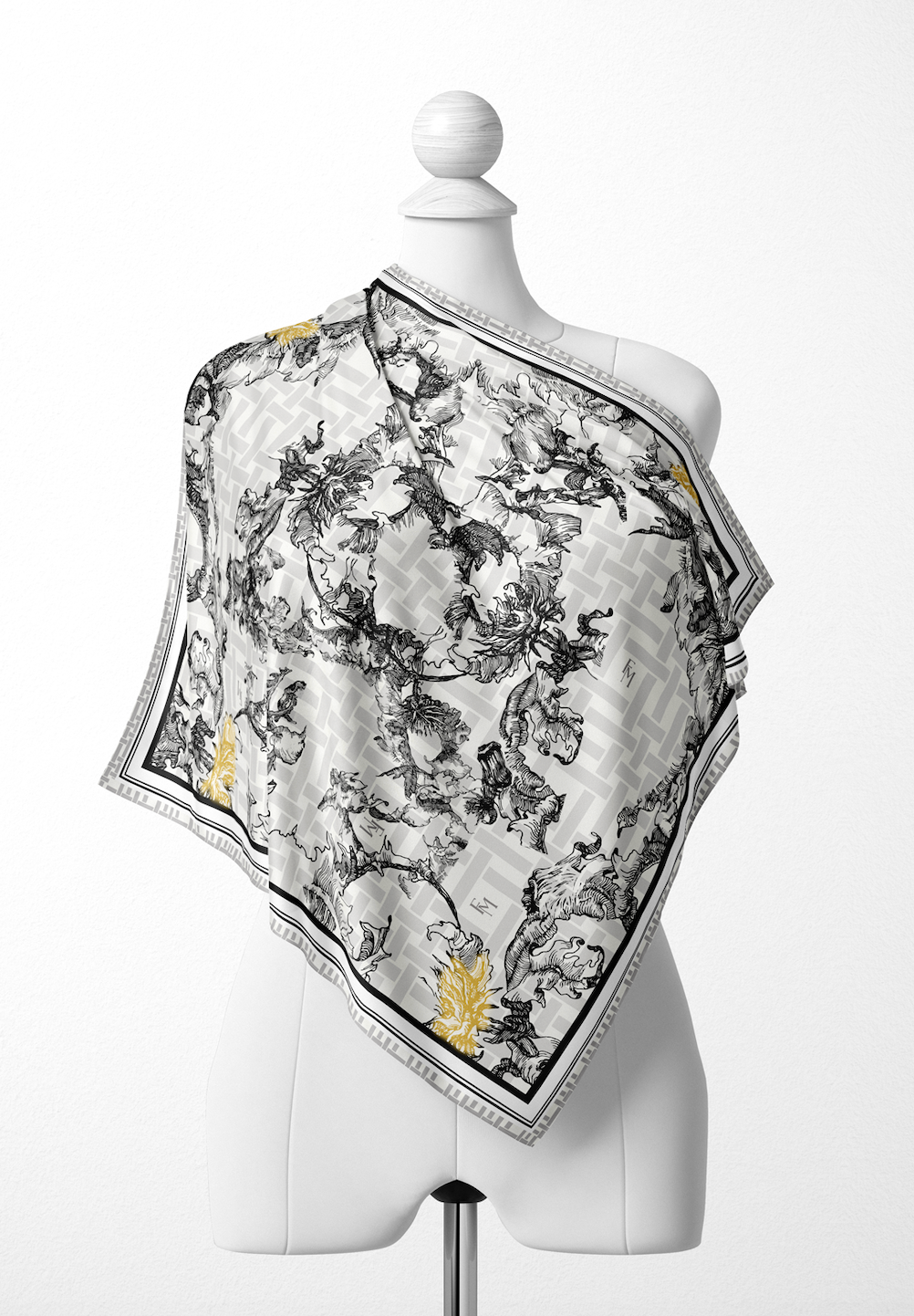This exquisite scarf showcases a symphony of whimsical floral patterns inspired by classic Asian artistry dance in harmony. Detailed flowers with swirling stems and lush petals are arranged in an ethereal composition. The outer border presents a stark geometric contrast with a Greek key design, lending a structured frame to the organic central imagery. Each corner is adorned with a subtle monogram, infusing a sense of exclusivity. This scarf is a statement piece that seamlessly marries the delicate beauty of nature with the precision of geometric design.