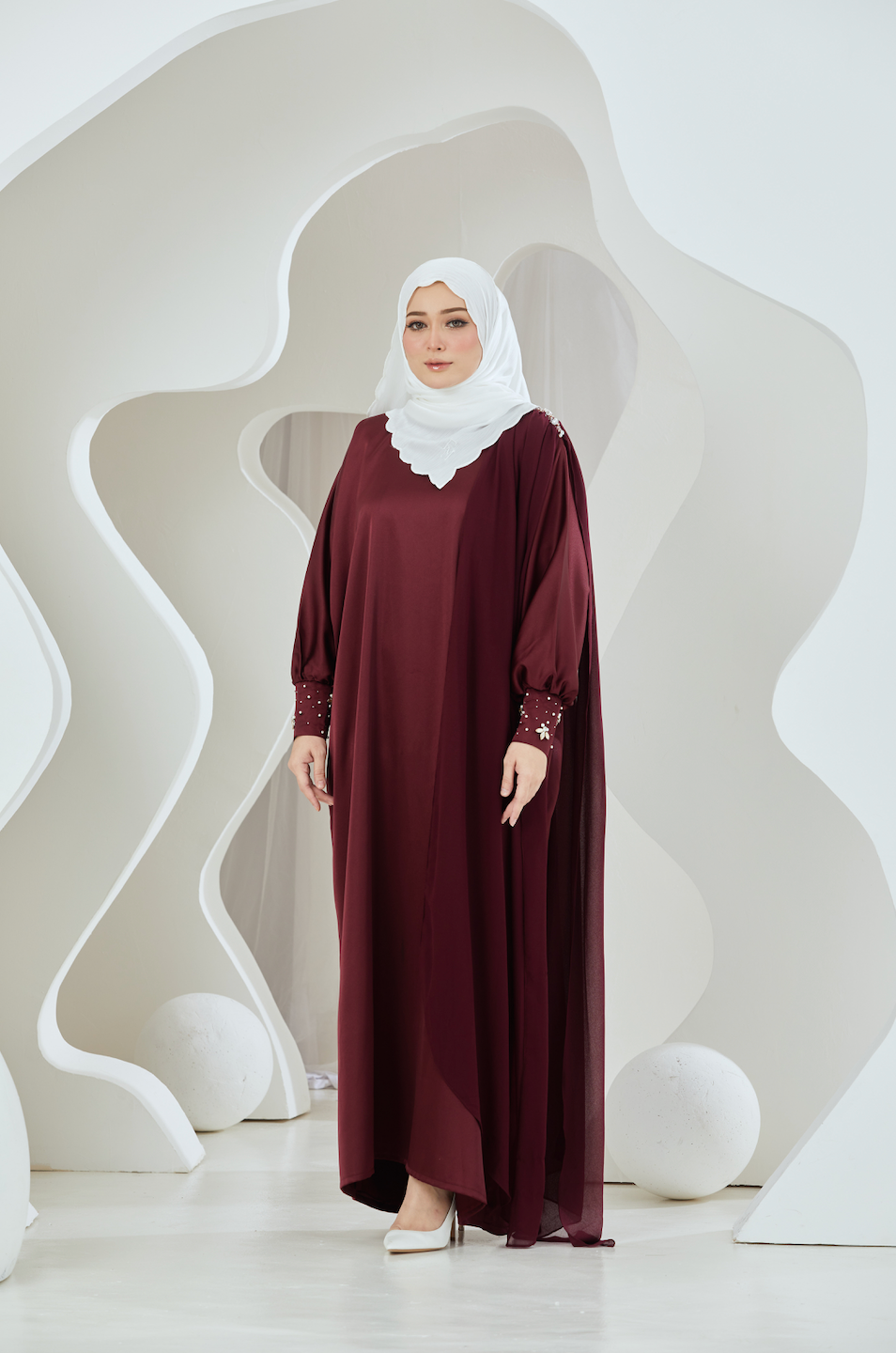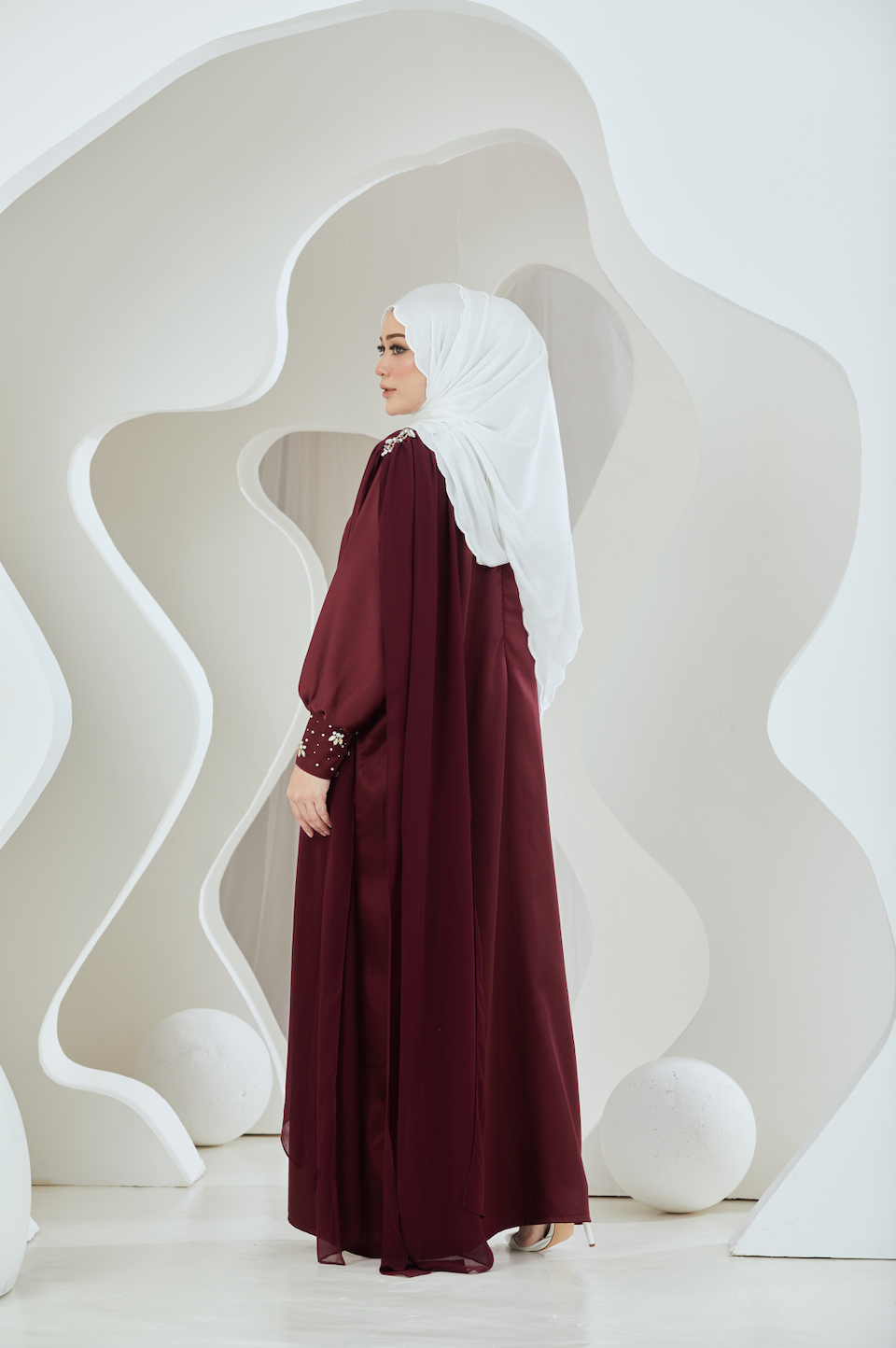 This Duchess Satin Abaya redefines luxury and elegance with its embellished sleeves and a delicate Chiffon Shoulder Sash. Crafted from sumptuous Duchess Satin, the abaya boasts a sleek and lustrous finish, offering an unparalleled touch of sophistication. The sleeves are meticulously adorned with intricate embellishments, adding a sparkle that catches the eye and enhances the garment's luxury appeal. A chiffon shoulder sash drapes elegantly, adding a fluid contrast to the satin's opulence and providing a graceful silhouette. Perfect for formal events, this abaya merges traditional modesty with contemporary elegance, making a statement in refined style.